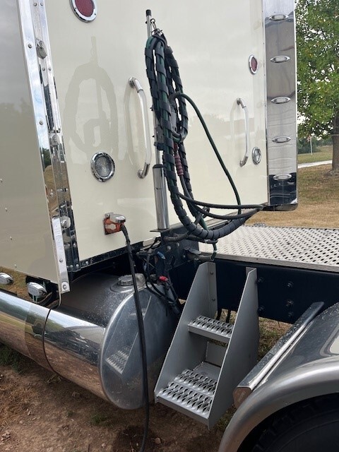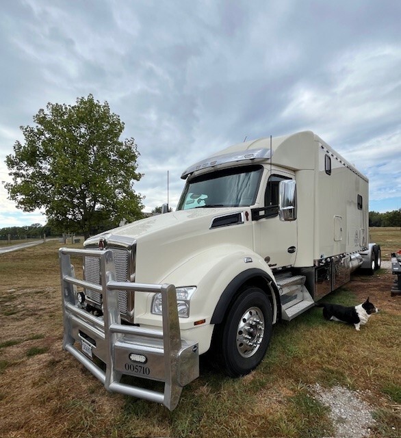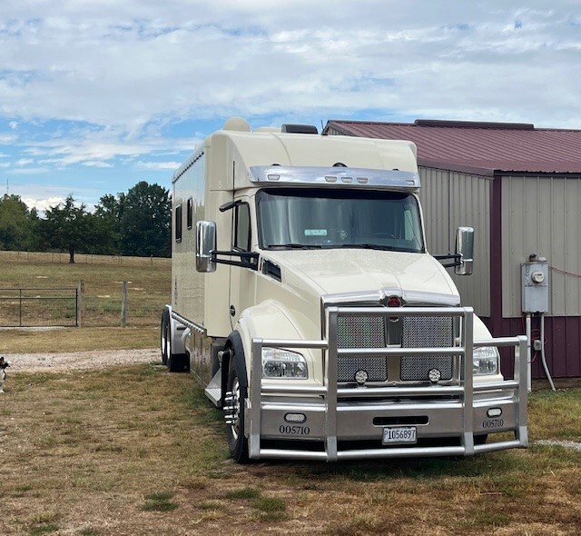 Transmission is a 13-spd Eaton Fuller UltraShift Automatic; 344” WB, Tires: 365 70R 22.5. 11R 24.5; 300-gal fuel capacity, weight 26,638 lbs.; Herd Defender Grill Guard Bumper; Torque 1850; Front axle rated at 16,500; Rear axles rated at 40,000; Gear Ratio is 3.25