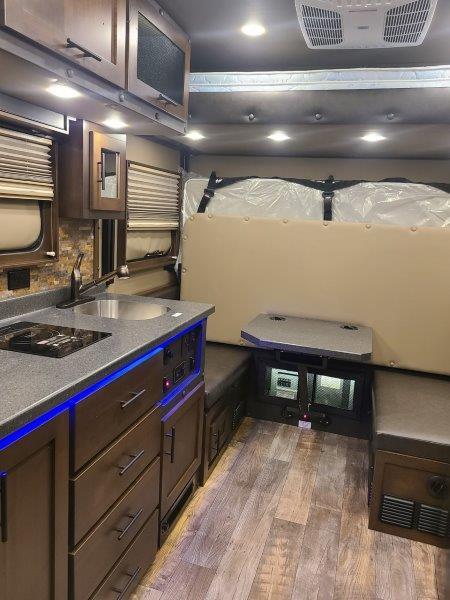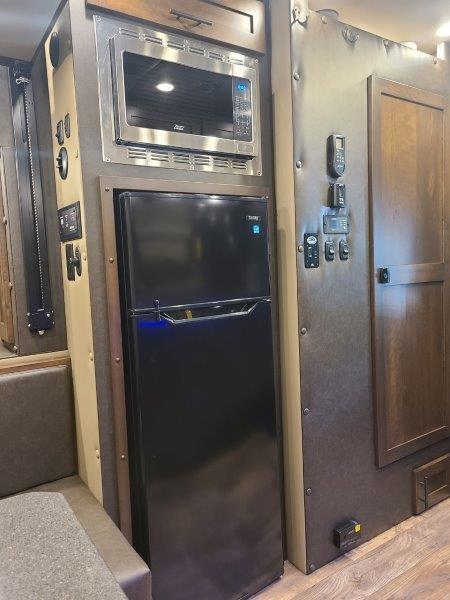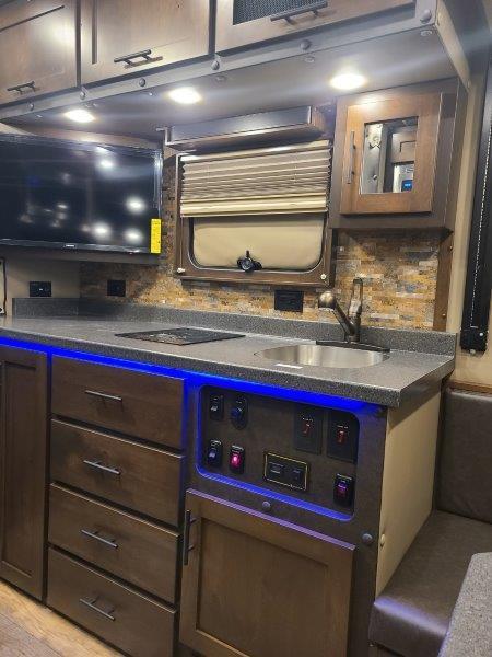 Standard Sleeper Features Include: Paint with 3 Year Warranty, 304 Mirror Finish Stainless Steel (Non-Magnetic); Stainless Steel Skirt (No Rivets); LED Clearance Lights in Stainless Steel Skirt; Light Weight Aluminum Structure; Flat Panel Solid Hardwood Door Fronts; Hidden Cabinet Door Hinges; TV Cabinet with Storage Behind TV; (4) Drawers Below Counter; Wardrobe Cabinet; Under Sink Storage Cabinet with Shelf; Door Struts in Overhead Cabinets; Cabinets Lined for Noise Reduction; Dividers in All Overhead Cabinets; Angled U-Shaped Overhead Cabinets; Two Bunk End Storage Cabinets; One Piece Fiberglass Shower with 13 Gallon Holding Tank and Bench Style Cassette Toilet; High Pressure, Water Saving, Shower Head; Single Control Shower Faucet; (2) Towel Hooks In Shower; Storage Basket in Shower; Mirror Inside of Shower Door; Hardwood Shower Door; Mattress; Bed Restraint; Premium Grade Residential Style Linoleum; Coat Hooks; LED Light Fixtures; LED Auto Light In Sink Cabinet; (2) USB Receptacles; Undermount Stainless Steel Sink; Décor High Rise Sink Faucet; Towel Bar to Sink Cabinet Door; Magnetic Strip to Boot Curtain; 24" x 16" Frameless Window With Hardwood Trim & Day/ Night Shade PS; Frameless Egress Window with Hardwood Trim & Day/Night Shade PS; Prepped for Future Satellite System; Smoke Detector; Heater/Air Conditioner with Wall Thermostat; Roof Vent with Remote & Smoked Exterior Cover; 32” High Def. LED Flat Panel TV; Extra HDMI Recepts In AV Cabinet Tied to TV; Sound Bar System with Subwoofer, Blu-ray, HD; TV Antenna with Booster; Household Style, 7.3 cf, 2 Door Refrig/Freezer; Interior Water Fill Access - Fill Tank with Jug; 30 Gallon Insulated Water Tank with Brass Fittings; City Water Hookup; Hot Water Heater with 6 Gallon Capacity; 30 Amp Shoreline - Marine Grade & Heavy Cord; Automatic Transfer Switch; and 3000 Watt Inverter/Charger w/ Remote Display.