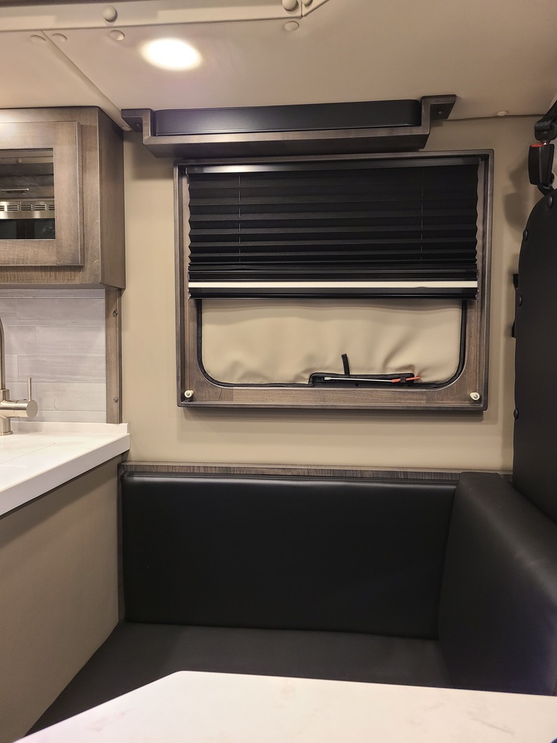 24” x 16” Frameless Window with Hardwood Trim & Day/Night Shade to PS; Frameless Egress Window with Hardwood Trim & Day to PS