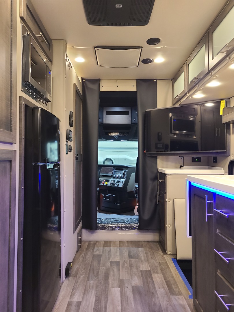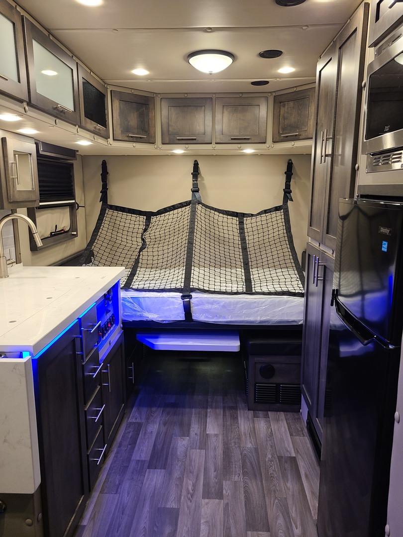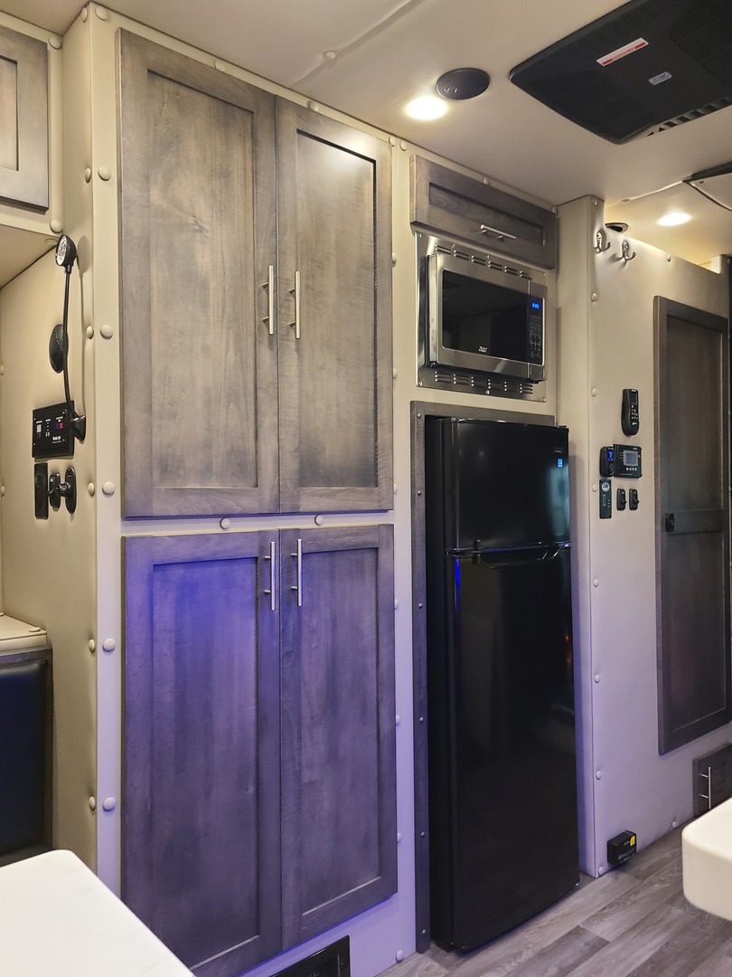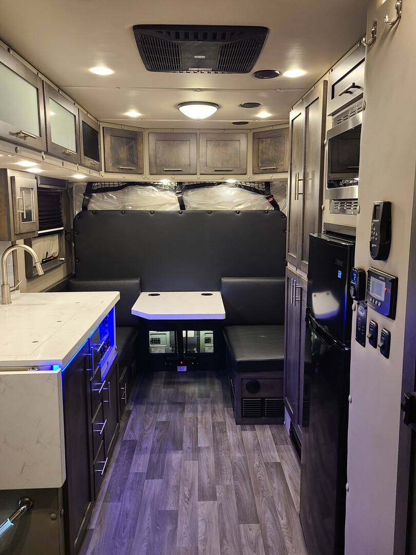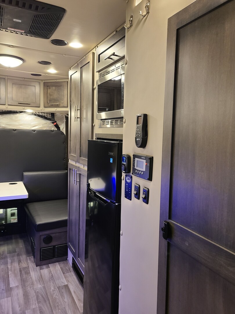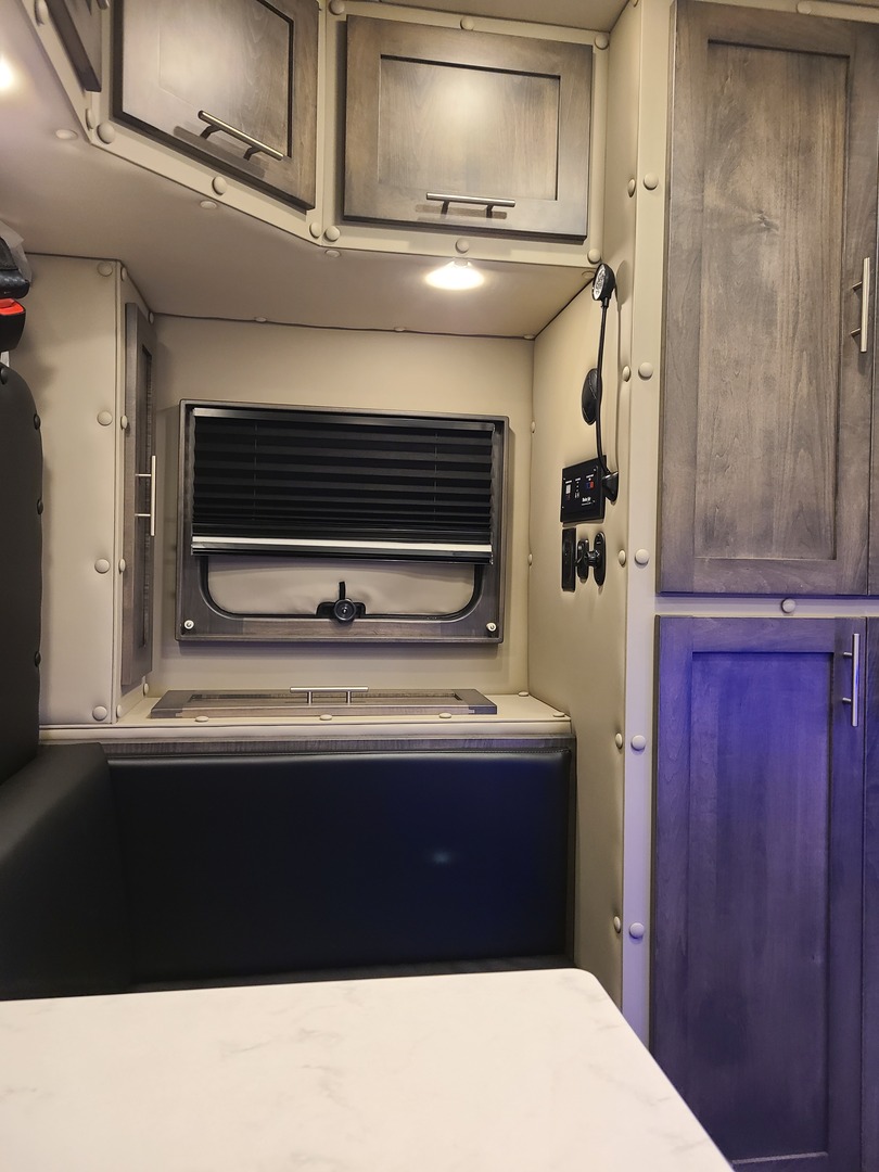 PACCAR Style Boot Ring*; PACCAR Exterior Doors; Structure is Water/Pressure Tested (Twice!); Tapered Aluminum Truss Rafters; 1” x 2” Aluminum Wall Studs; 3-1/2” Fully Insulated Floor; Waterproof Smooth Underbelly; Rain Cover for Roof Vent; Premium Water Lines with SS Constant Tension Clamps; Brass Water Line Fittings; Water Pressure Relief Valve; Water Fill Hose; Heated Shower; Smoke & Carbon Monoxide Detectors; Battery Voltage Monitor; Electrical Wiring Encased in Loom; GFI Kitchen Receptacle; Oversized Rocker Light Switches; High Density 10 year Cushion Foam*; Name Brand Appliances; Soap Dispenser in Shower; Insulated Window Inserts; Day/Night Shades; LED Auto Lights in Wardrobe*; Cedar Floor in Wardrobe* (*- Where Applicable)