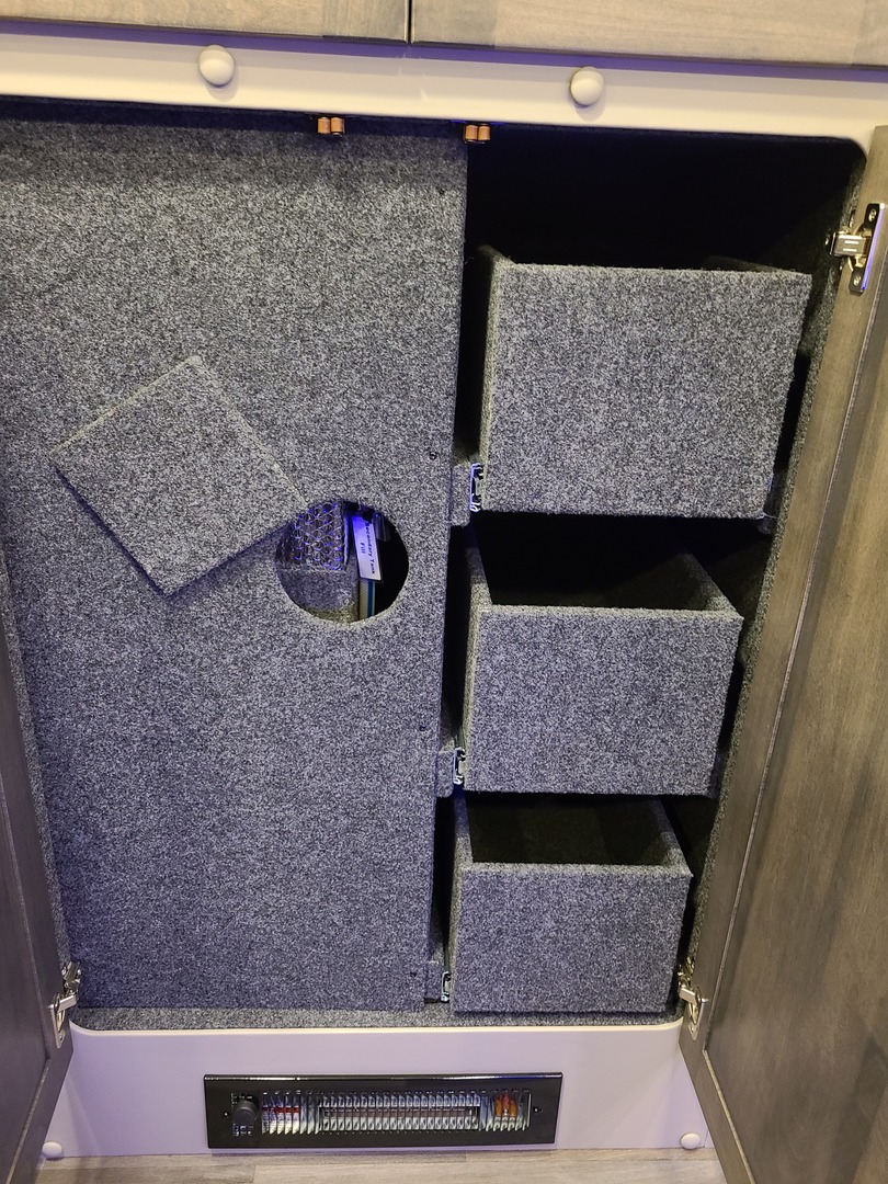 Light Weight Aluminum Structure; Flat Panel, Solid Hardwood Door Fronts; Etched/Frosted Glass Inserts to OHC Doors; Hidden Cabinet Door Hinges; TV Cabinet with Storage Behind TV; Spice Rack Above Side Entry Door; (4) Drawers Below Counter; Drawer PS Front; Wardrobe Cabinet; Under Sink Storage Cabinet with Shelf; Door Struts in Overhead Cabinets; Cabinets Lined for Noise Reduction; Dividers in All Overhead Cabinets; Audio/Visual Entertainment Cabinet; Angled U-Shaped Overhead Cabinets; (2) Bunk-End Storage Cabinets; (2) Single Door Cabinets; Pantry with Pull-Out Shelves; Double Door Cabinet with Adjustable Shelves