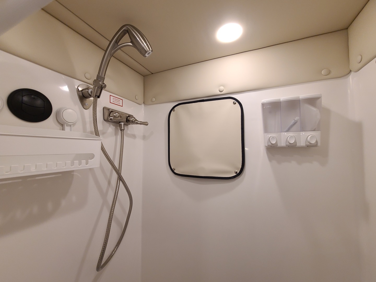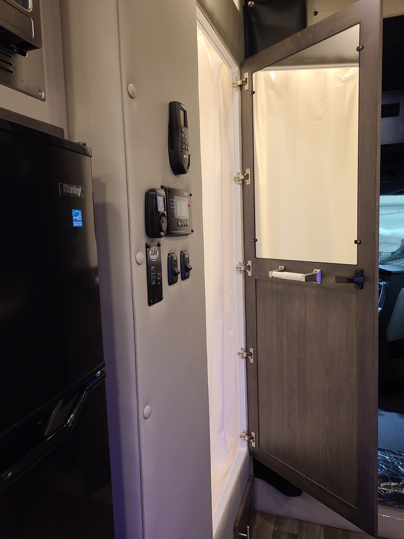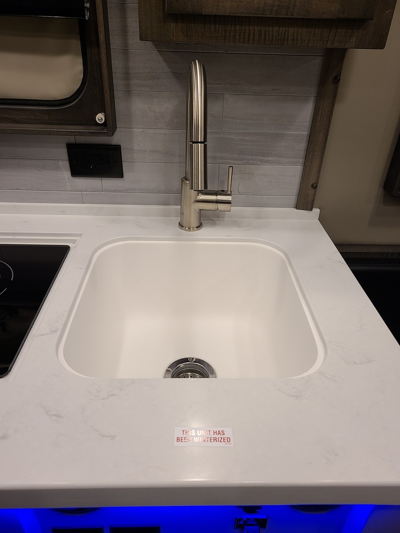 One-Piece Fiberglass Shower with Bench-Style Cassette Toilet; High Pressure, Water Saving Shower Head; Double Control Shower Faucet; (2) Towel Hooks in Shower; Storage Basket in Shower; Hardwood Shower Door; Mirror Inside Shower Door; Interior Water Fill Access – Fill Tank with Jug; 30 Gallon Insulated Water Tank with Brass Fittings; City Water Hookup; Hot Water Heater with 6 Gallon Capacity; Décor High Rise Sink Faucet