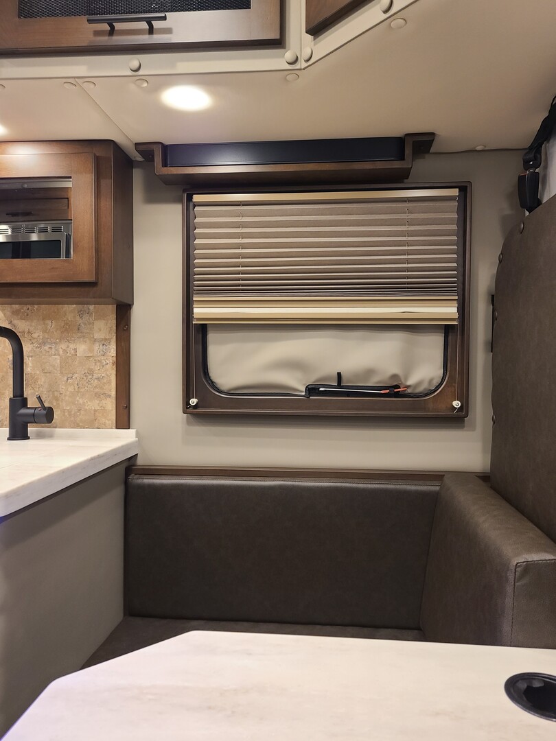 24” x 16” Frameless Window with Hardwood Trim & Day/Night Shade to PS; Frameless Egress Window with Hardwood Trim & Day to PS
