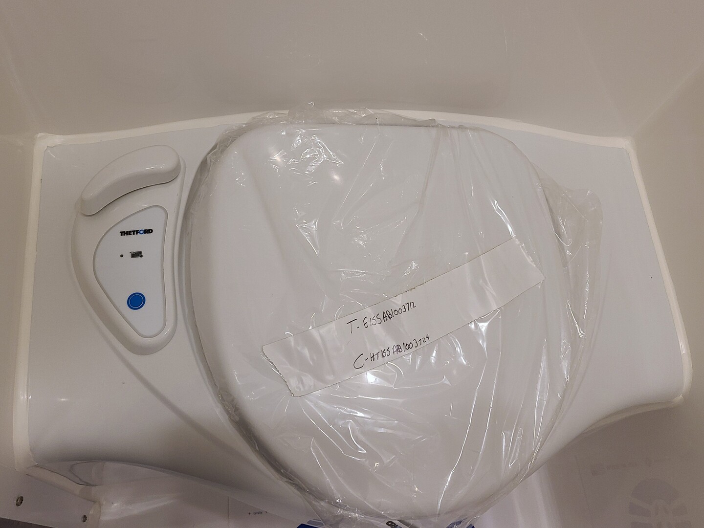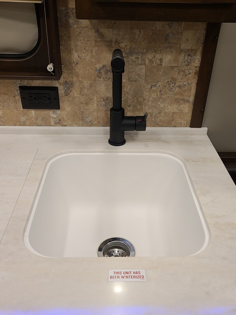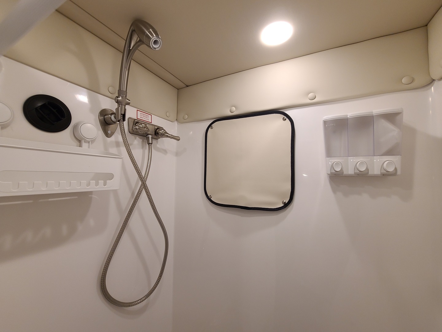One-Piece Fiberglass Shower with Bench-Style Cassette Toilet; High Pressure, Water Saving Shower Head; Double Control Shower Faucet; (2) Towel Hooks in Shower; Storage Basket in Shower; Hardwood Shower Door; Mirror Inside Shower Door; Interior Water Fill Access – Fill Tank with Jug; 30 Gallon Insulated Water Tank with Brass Fittings; City Water Hookup; Hot Water Heater with 6 Gallon Capacity; Décor High Rise Sink Faucet