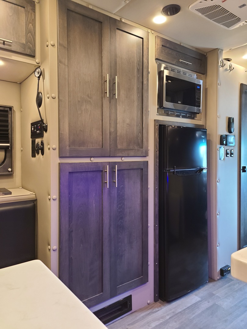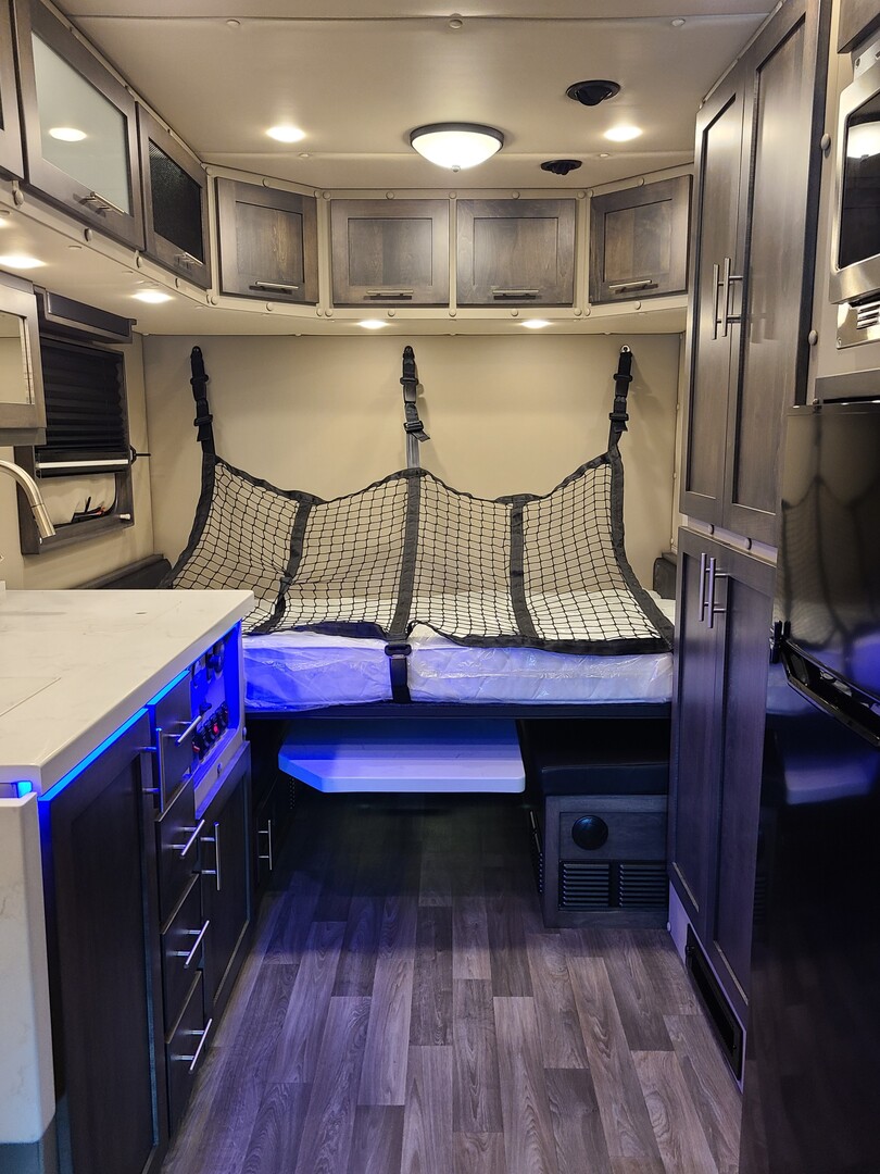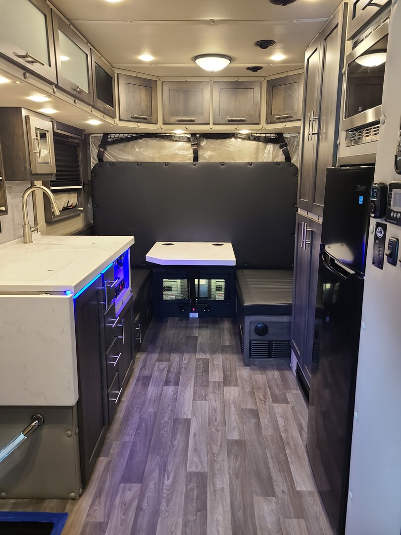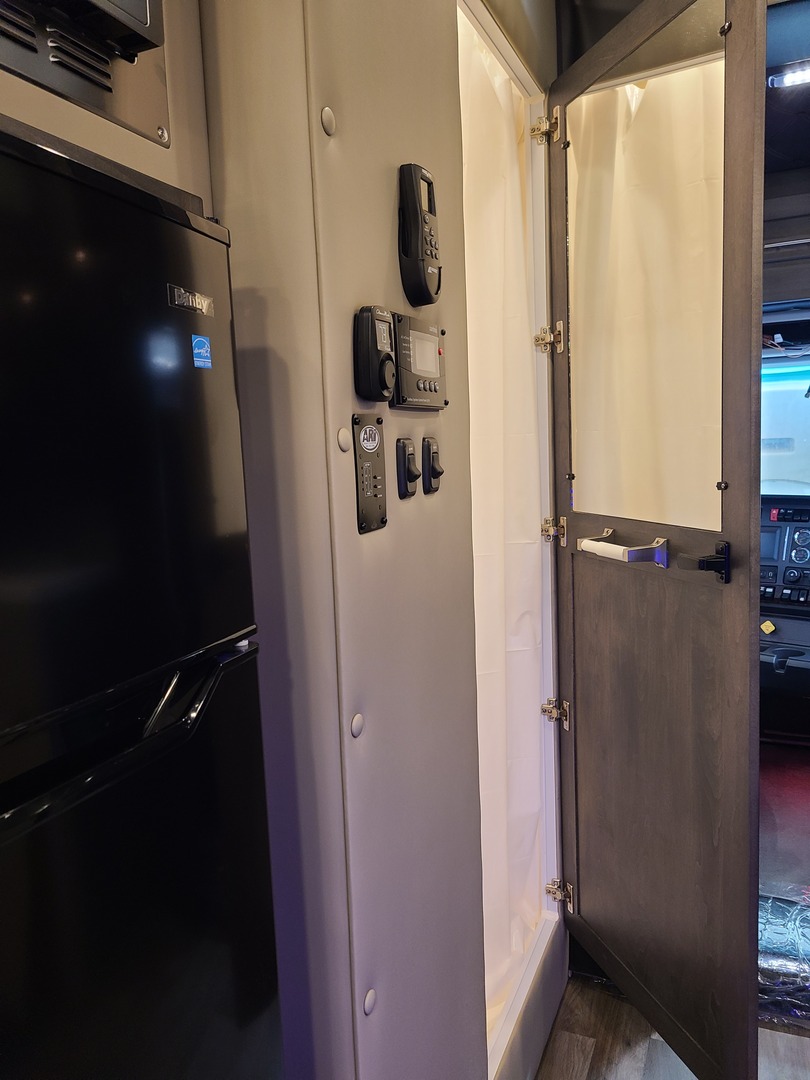 PACCAR Style Boot Ring*; PACCAR Exterior Doors; Structure is Water/Pressure Tested (Twice!); Tapered Aluminum Truss Rafters; 1” x 2” Aluminum Wall Studs; Fiberglass Wall Insulation (Cut & Fitted); 3-1/2” Fully Insulated Floor; Waterproof Smooth Underbelly; Rain Cover for Roof Vent; Premium Water Lines with SS Constant Tension Clamps; Brass Water Line Fittings; Water Pressure Relief Valve; Water Fill Hose; Heated Shower; Smoke & Carbon Monoxide Detectors; Battery Voltage Monitor; Electrical Wiring Encased in Loom; GFI Kitchen Receptacle; Oversized Rocker Light Switches; High Density 10 year Cushion Foam*; Name Brand Appliances; Soap Dispenser in Shower; Insulated Window Inserts; Day/Night Shades; LED Auto Lights in Wardrobe*; Cedar Floor in Wardrobe* (*- Where Applicable.)