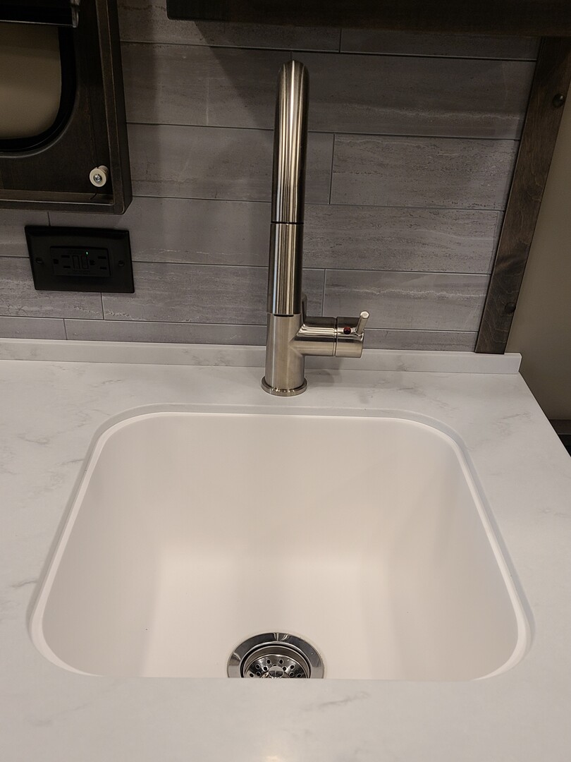 One-Piece Fiberglass Shower with Bench-Style Cassette Toilet, No Grey Holding Tank; High Pressure, Water Saving Shower Head; Double Control Shower Faucet; (2) Towel Hooks in Shower; Storage Basket in Shower; Hardwood Shower Door; Mirror Inside Shower Door; Interior Water Fill Access – Fill Tank with Jug; 30-Gallon Insulated Water Tank with Brass Fittings; City Water Hookup; Hot Water Heater with 6 Gallon Capacity; Décor High Rise Sink Faucet