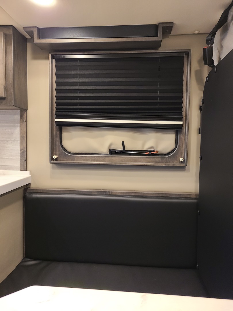 24” x 16” Frameless Window with Hardwood Trim & Day/Night Shade to PS; Frameless Egress Window with Hardwood Trim & Day to PS