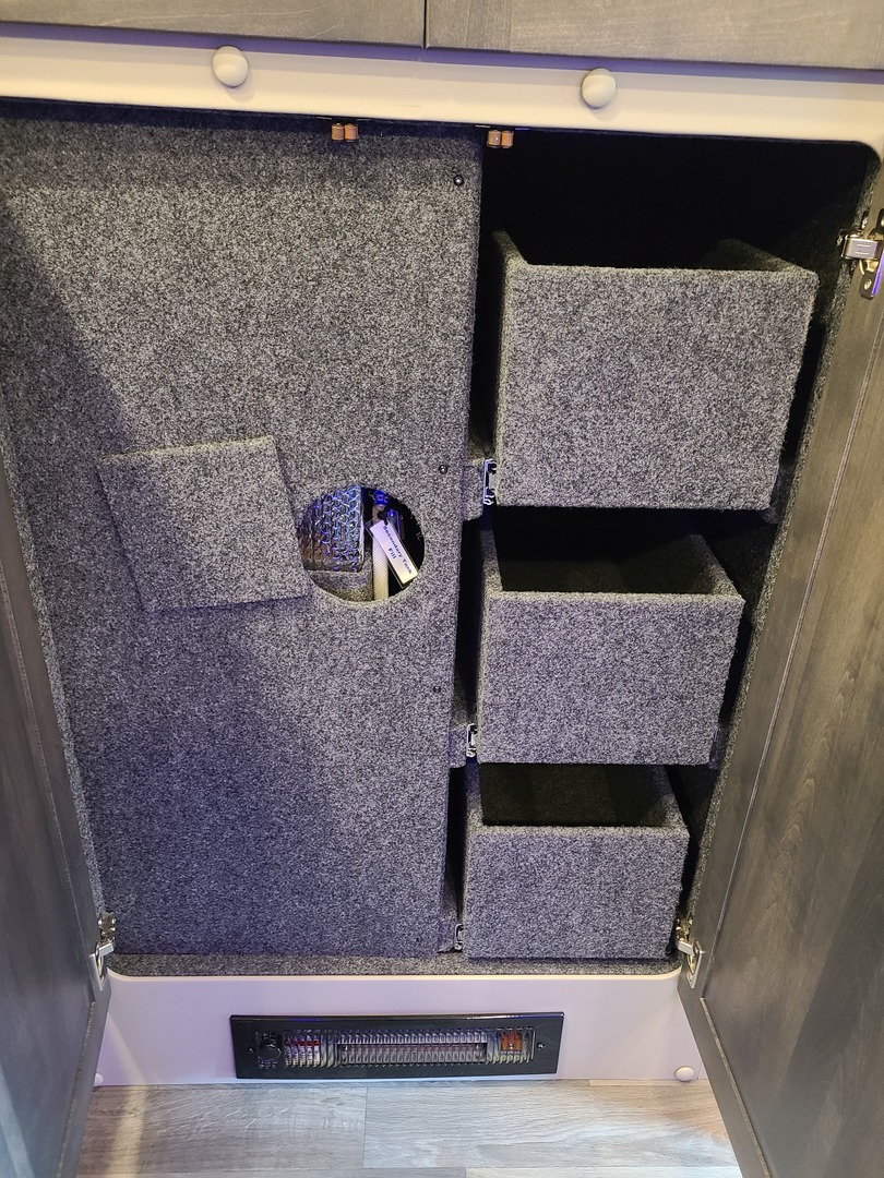 Light Weight Aluminum Structure; Flat Panel, Solid Hardwood Door Fronts; Etched/Frosted Glass Inserts to OHC Doors; Hidden Cabinet Door Hinges; TV Cabinet with Storage Behind TV; Spice Rack Above Side Entry Door; (4) Drawers Below Counter; Drawer PS Front; Wardrobe Cabinet; Under Sink Storage Cabinet with Shelf; Door Struts in Overhead Cabinets; Cabinets Lined for Noise Reduction; Dividers in All Overhead Cabinets; Audio Visual/Entertainment Cabinet; Angled U-Shaped Overhead Cabinets; (2) Bunk-End Storage Cabinets; (2) Single Door Cabinets; Pantry with Pull-Out Shelves; Double Door Cabinet with Adjustable Shelves