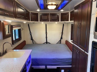 Standard Sleeper includes stainless Steel Skirt, Light Weight Aluminum Structure, Raised Panel Door Fronts, 1 Wardrobe Cabinet, U Shaped Overhead Cabinets, Under Sink Storage Cabinet with Shelf, Door Struts In Overhead Cabinets, Cabinets Lined with Cargo Liner For Noise Reduction, One Piece Seamless Shower with Cassette Porti Potti, Premium Grade Residential Style Linoleum, LED Light Fixtures, Hardwood Shower Door, Large White Bar Sink with High Profile Faucet, Egress Window with Hardwood Trim & Day/Night Shade, Standard Window with Hardwood Trim & Day/Night Shade, Heater/Air Conditioner with Wall Thermostat (Tied To Tractor), Fantastic Fan with Smoked Cover, Surround Sound System, TV Antenna with Booster, Large 2 Door Norcold 0061 Refrigerator, 30 Amp Marine Grade Stainless Steel Shoreline Plug, Automatic Transfer Switch.