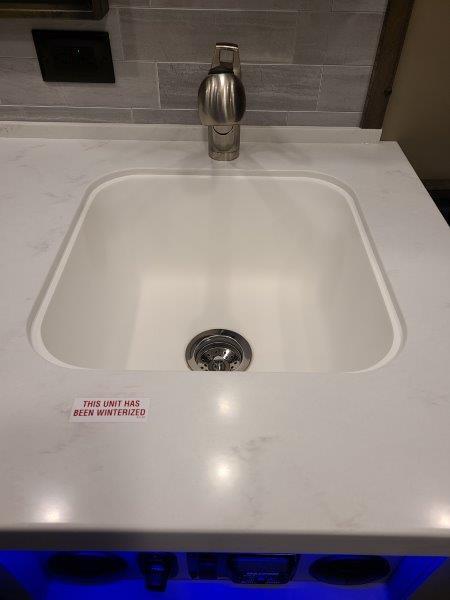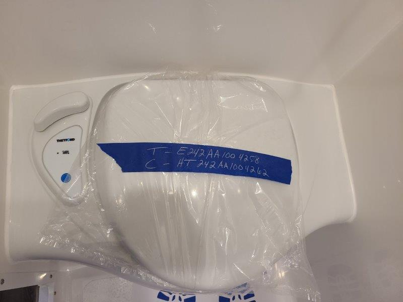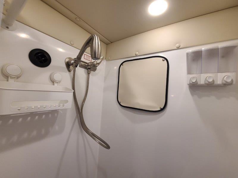 One-Piece Fiberglass Shower with 13 Gallon Holding Tank & Bench-Style Cassette Toilet; High Pressure, Water Saving Shower Head; Single Control Shower Faucet; (2) Towel Hooks in Shower; Storage Basket in Shower; Hardwood Shower Door; Mirror Inside Shower Door; Interior Water Fill Access – Fill Tank with Jug; 30 Gallon Insulated Water Tank with Brass Fittings; City Water Hookup; Hot Water Heater with 6 Gallon Capacity; Décor High Rise Sink Faucet
