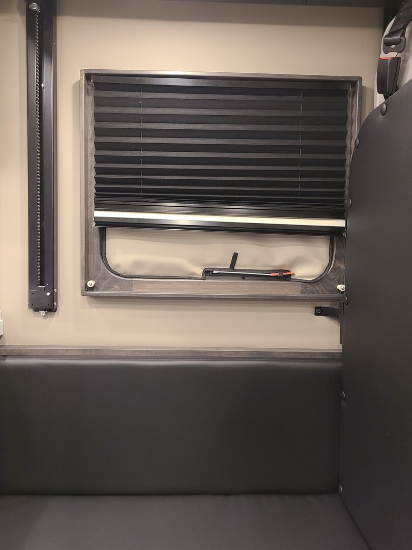 24” x 16” Frameless Window with Hardwood Trim & Day/Night Shade to PS; Frameless Egress Window with Hardwood Trim & Day to PS