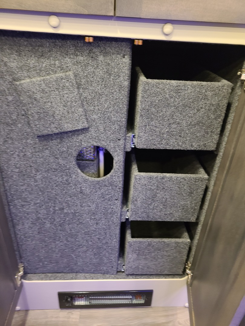 Light Weight Aluminum Structure; Flat Panel, Solid Hardwood Door Fronts; Etched/Frosted Glass Inserts to OHC Doors; Hidden Cabinet Door Hinges; TV Cabinet with Storage Behind TV; Spice Rack Above Side Entry Door; (4) Drawers Below Counter; Drawer PS Front; Wardrobe Cabinet; Under Sink Storage Cabinet with Shelf; Door Struts in Overhead Cabinets; Cabinets Lined for Noise Reduction; Dividers in All Overhead Cabinets; Audio Visual/Entertainment Cabinet; Angled U-Shaped Overhead Cabinets; (2) Bunk-End Storage Cabinets; (2) Single Door Cabinets; Pantry with Pull-Out Shelves; Double Door Cabinet with Adjustable Shelves