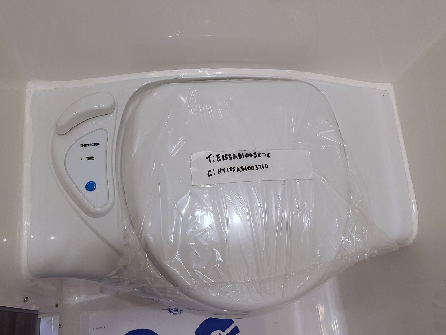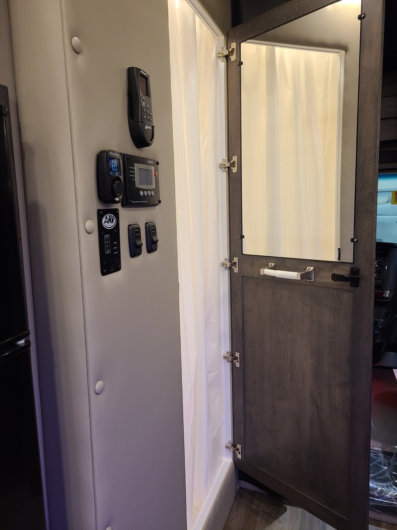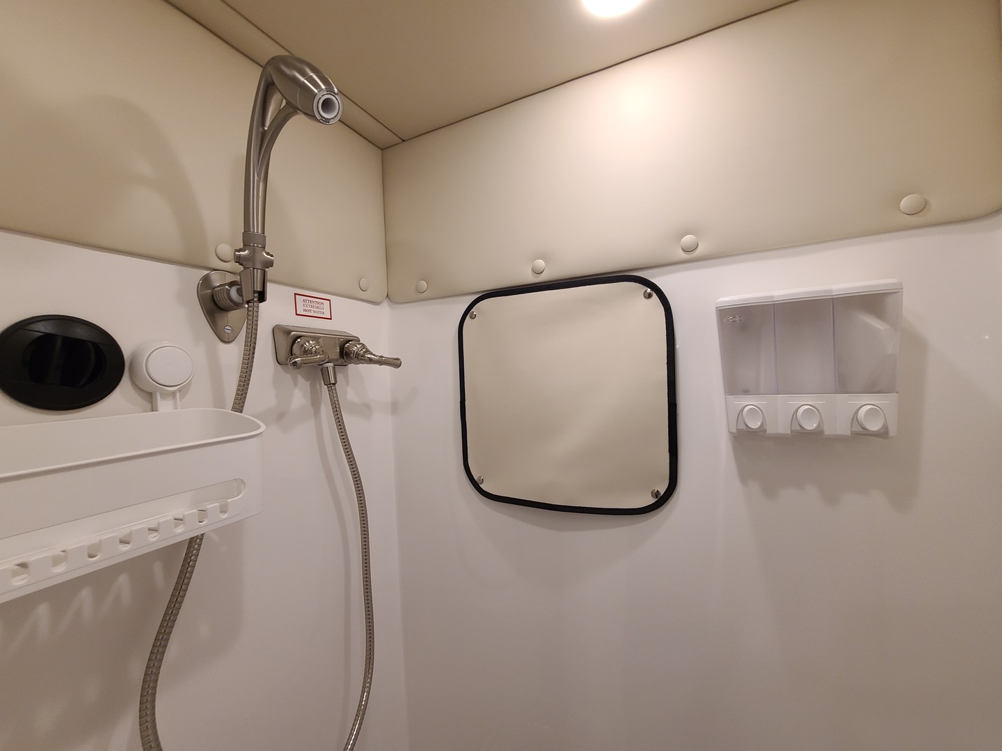 One-Piece Fiberglass Shower with Bench-Style Cassette Toilet, No Grey Holding Tank; High Pressure, Water Saving Shower Head; Double Control Shower Faucet; (2) Towel Hooks in Shower; Storage Basket in Shower; Hardwood Shower Door; Mirror Inside Shower Door; Interior Water Fill Access – Fill Tank with Jug; 30-Gallon Insulated Water Tank with Brass Fittings; City Water Hookup; Hot Water Heater with 6 Gallon Capacity; Décor High Rise Sink Faucet